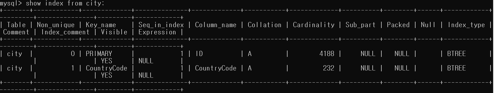 MySQL에 있는 테스트 데이터베이스인 world의 city라는 테이블을 사용하여 순차검색과 인덱스의 성능차이를 알아보겠습니다.